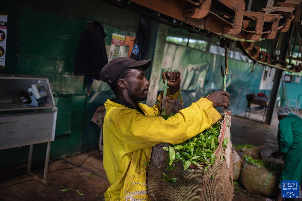這是2023年5月4日,工人在肯尼亞首都內羅畢附近的茶廠(chǎng)里搬運茶葉。