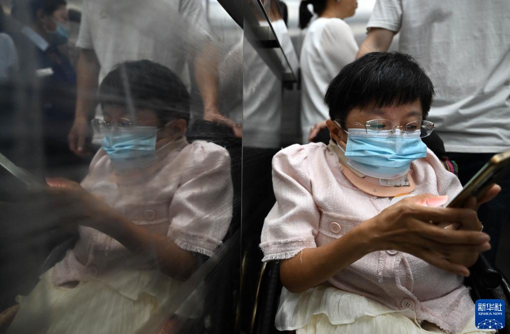 在天津市武清區人民醫院,魏瑞紅乘坐電梯時(shí)用手機和他人交流(5月19日攝)。