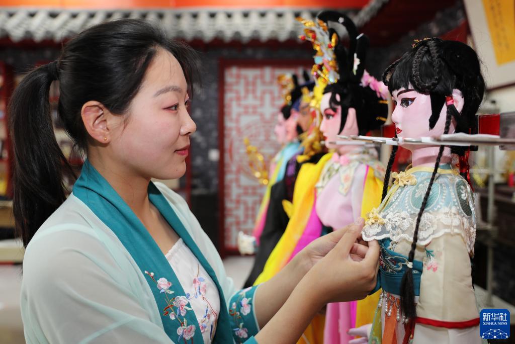 5月21日,在山東青島,萊西木偶藝術(shù)團的演員在整理木偶裝扮。