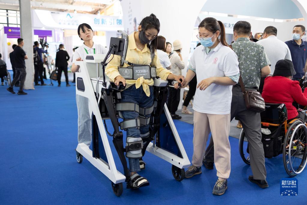5月21日,在2023中國國際福祉博覽會(huì )上,一名參觀(guān)者試用名下肢外骨骼機器人。這款機器人以主被動(dòng)訓練結合的方式為下肢肢殘患者進(jìn)行康復運動(dòng)訓練。