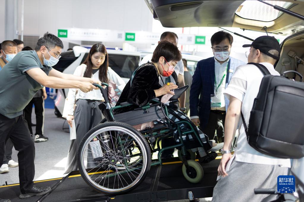 5月21日,在2023中國國際福祉博覽會(huì )上,參觀(guān)者體驗福祉汽車(chē)。福祉車(chē)專(zhuān)門(mén)為行動(dòng)不便人群設計,為坐輪椅的乘客提供了升降平臺,汽車(chē)座椅也可伸出車(chē)外,方便乘客上下車(chē)。