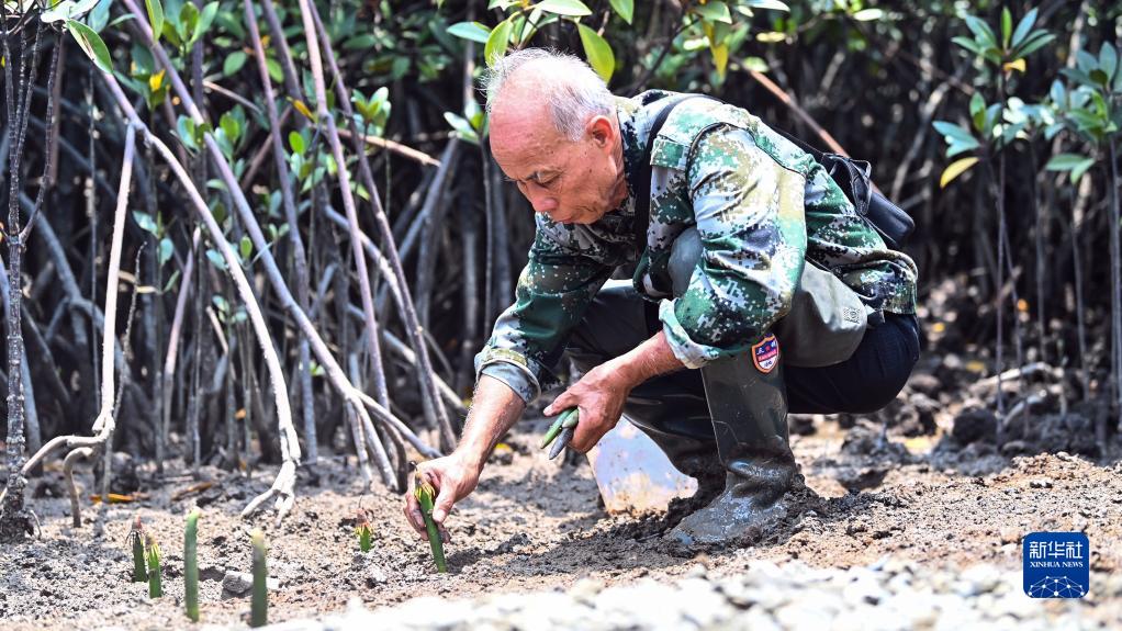 莫積瑞老人培育紅樹(shù)林種子(5月20日攝)。