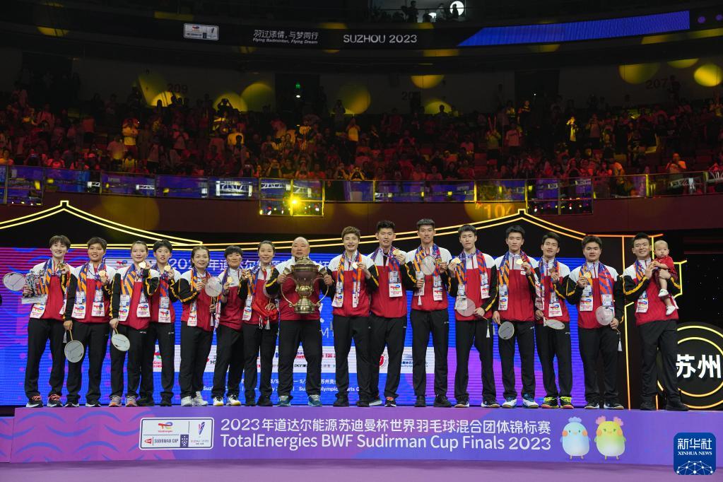 當日,2023年蘇迪曼杯世界羽毛球混合團體錦標賽頒獎儀式在江蘇省蘇州市舉行。中國隊在決賽中以3比0戰勝韓國隊,奪得冠軍。