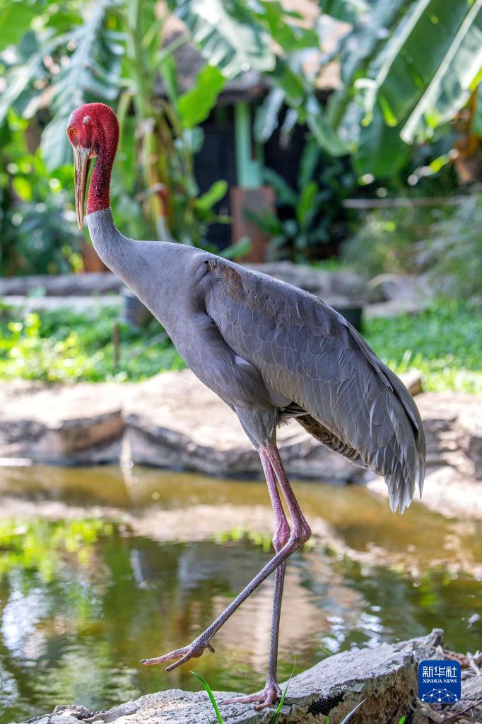 這是5月16日在泰國呵叻府動(dòng)物園赤頸鶴保育中心拍攝的赤頸鶴。