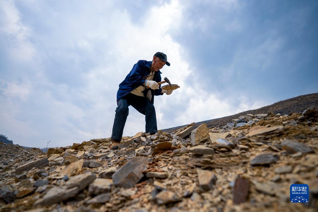 張世山在昆陽(yáng)磷礦礦坑里搜尋化石(5月10日攝)。