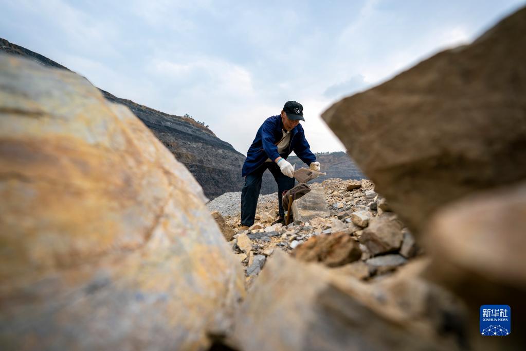 張世山用報紙包裹在昆陽(yáng)磷礦礦坑內找到的一塊化石(5月10日攝)。