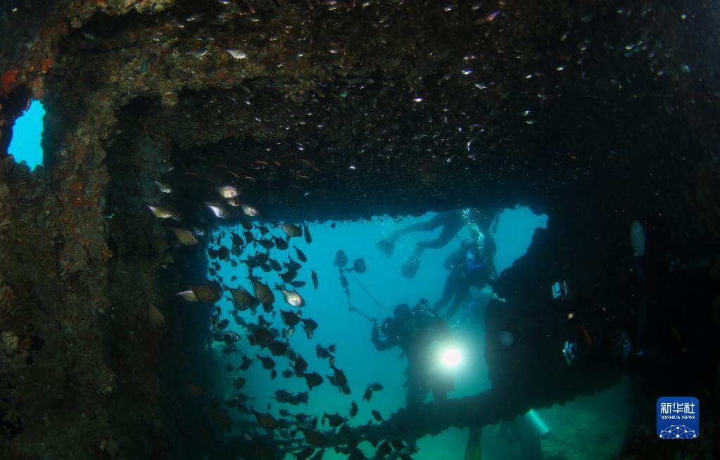 攝影愛(ài)好者在蜈支洲島海域海洋牧場(chǎng)拍攝沉船魚(yú)礁內的魚(yú)群(2021年5月21日攝)。