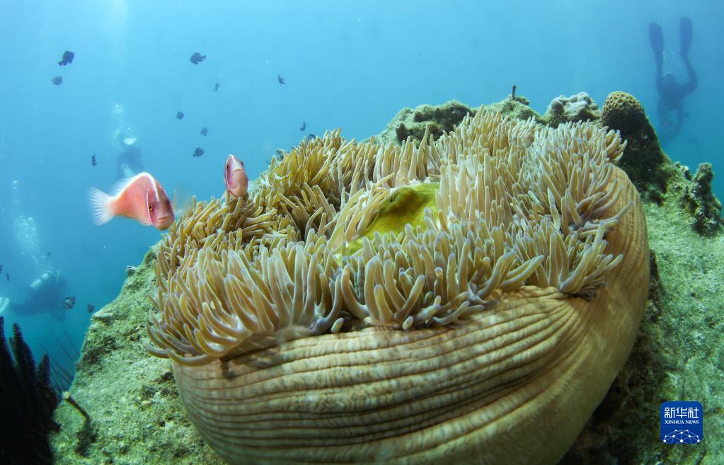 這是在蜈支洲島海域海洋牧場(chǎng)拍攝的小丑魚(yú)和???021年5月22日攝)。