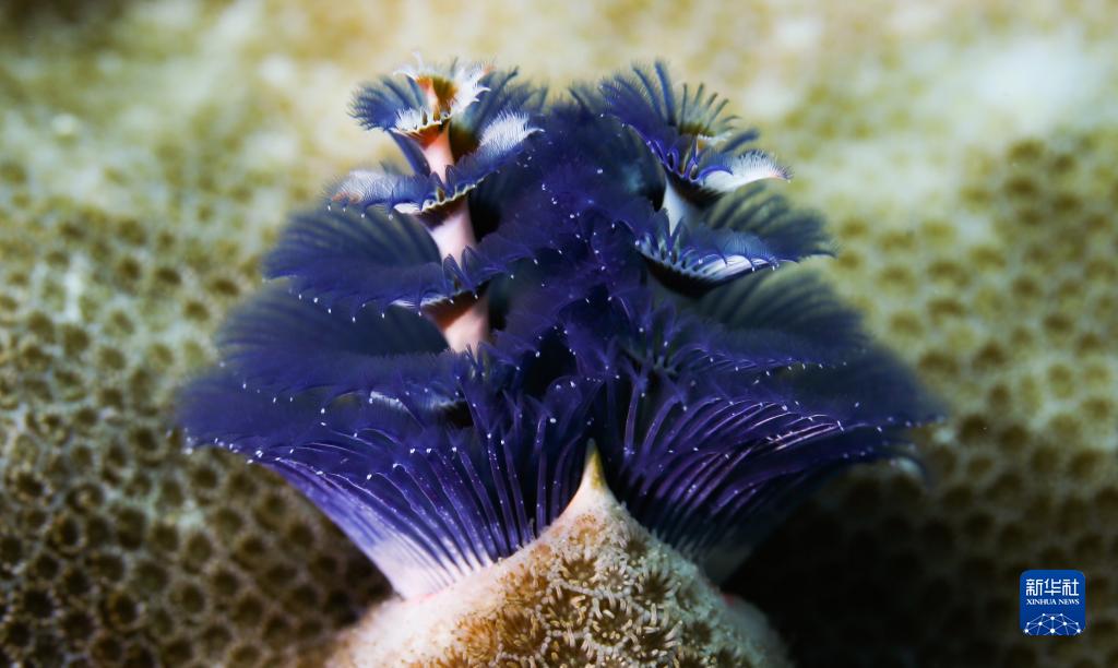 這是在蜈支洲島海域海洋牧場(chǎng)拍攝的圣誕樹(shù)管蟲(chóng)(2021年5月23日攝)。