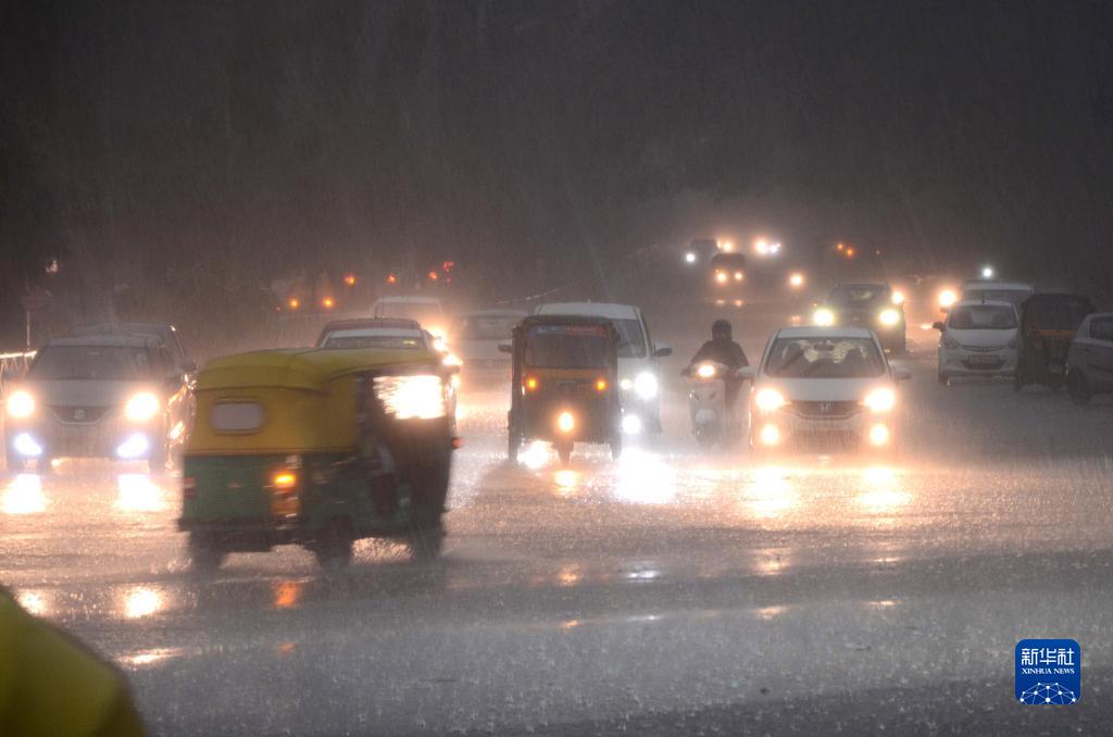 5月21日,在印度班加羅爾,車(chē)輛在積水的街道上行進(jìn)。