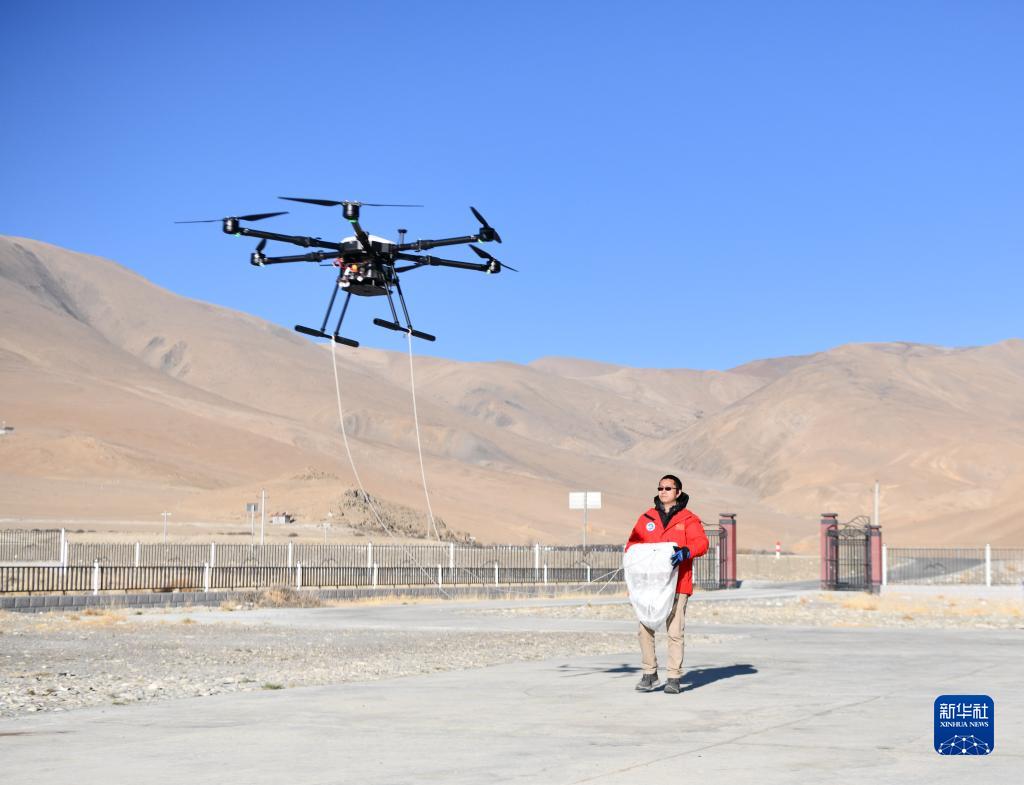 在中國科學(xué)院珠穆朗瑪大氣與環(huán)境綜合觀(guān)測研究站,科考隊員放飛無(wú)人機采集空氣樣本(5月10日攝)。