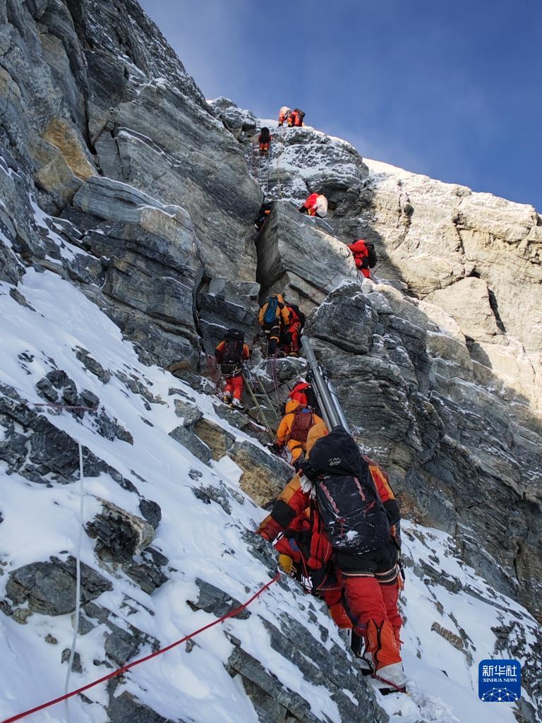 5月23日,2023年珠峰科考登頂隊員在沖頂。