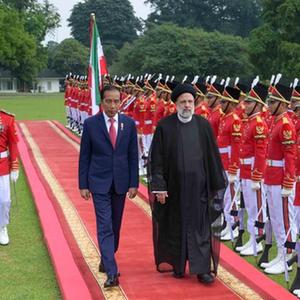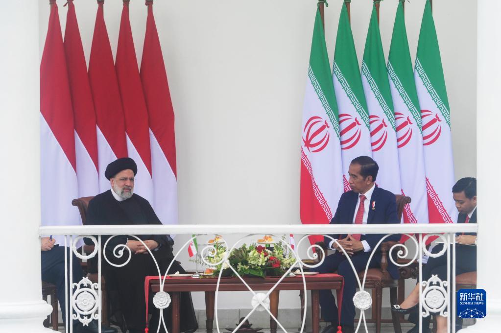 5月23日,在印度尼西亞茂物總統府,印尼總統佐科(右二)和到訪(fǎng)的伊朗總統易卜拉欣·萊希交談。