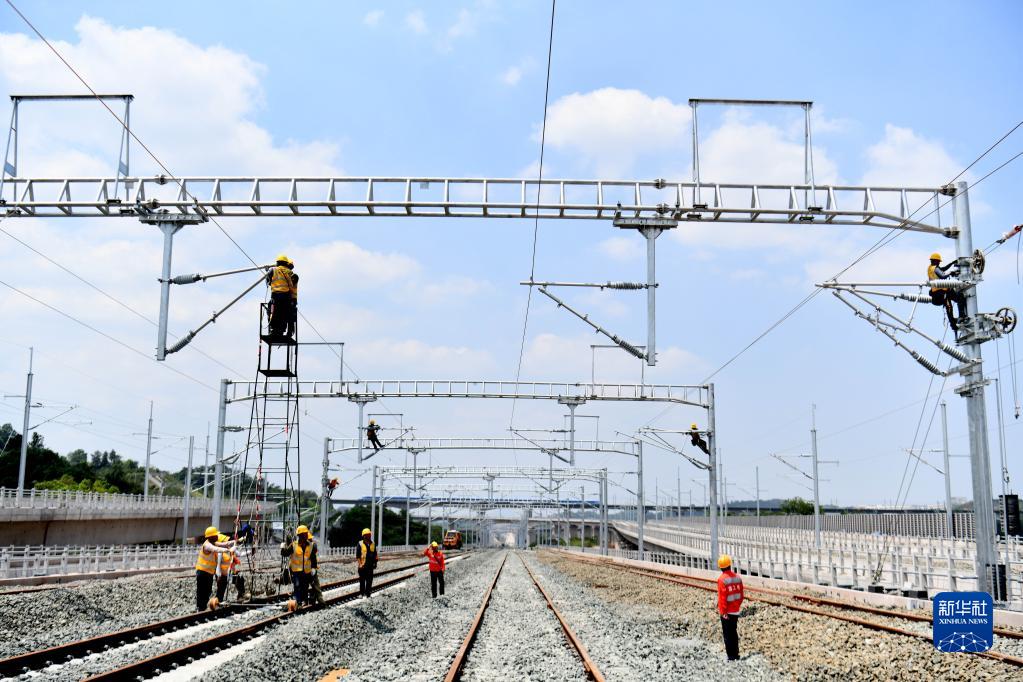 5月23日,在成宜高鐵宜賓站,施工人員在架設接觸網(wǎng)。