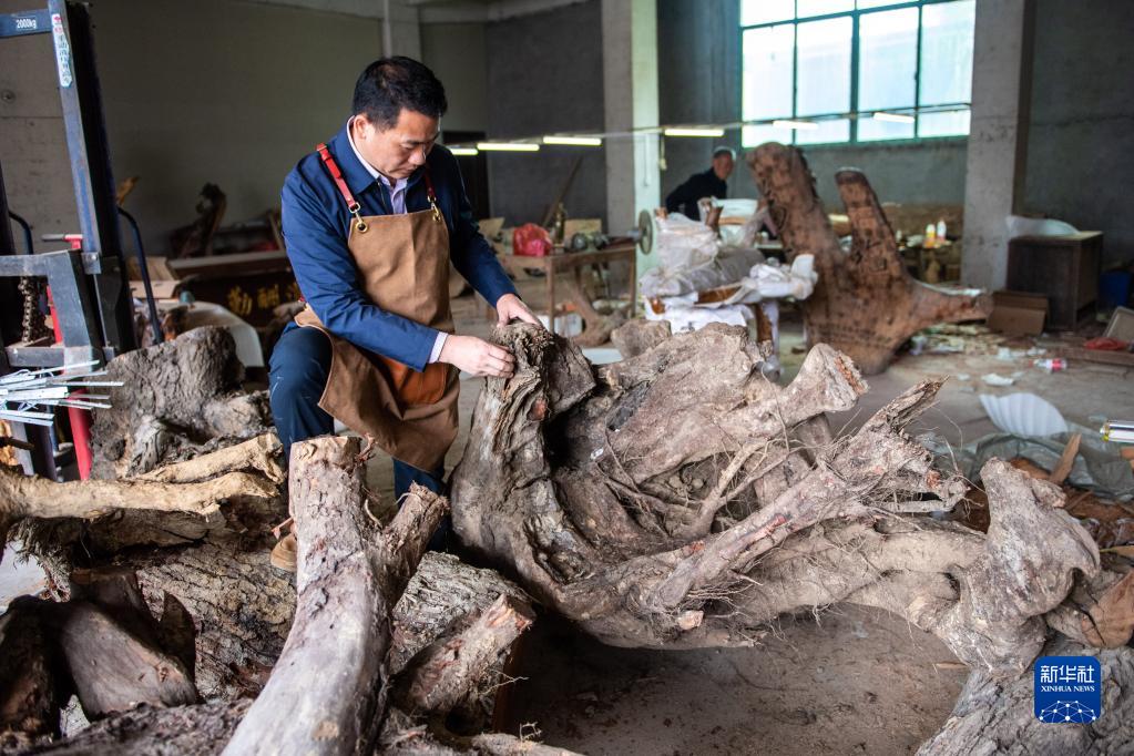 5月23日,在洞口縣巖山鎮陽(yáng)家山村,洞口木雕非遺傳承人傅立先在挑選木雕材料。