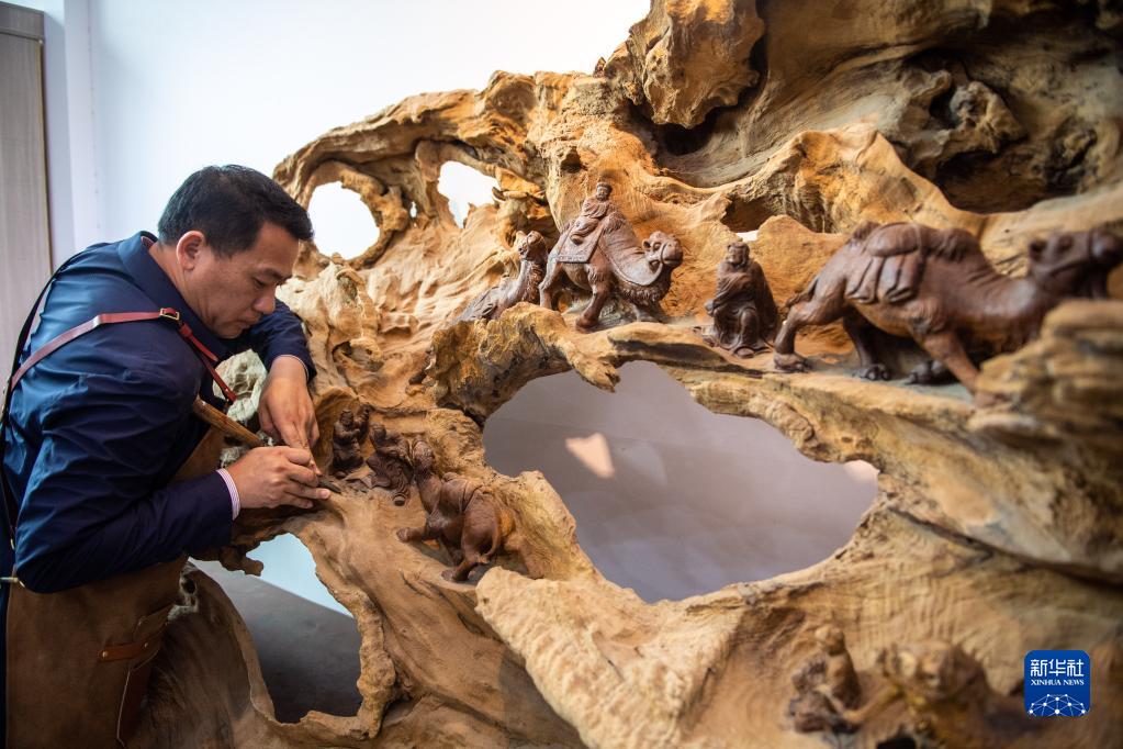5月23日,在洞口縣巖山鎮陽(yáng)家山村,洞口木雕非遺傳承人傅立先在創(chuàng )作木雕作品《絲綢之路》。
