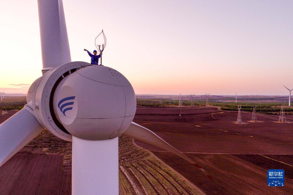 5月23日,工人在興安盟烏蘭浩特市呼和馬場(chǎng)風(fēng)力光伏發(fā)電場(chǎng)檢修風(fēng)機(無(wú)人機照片)。