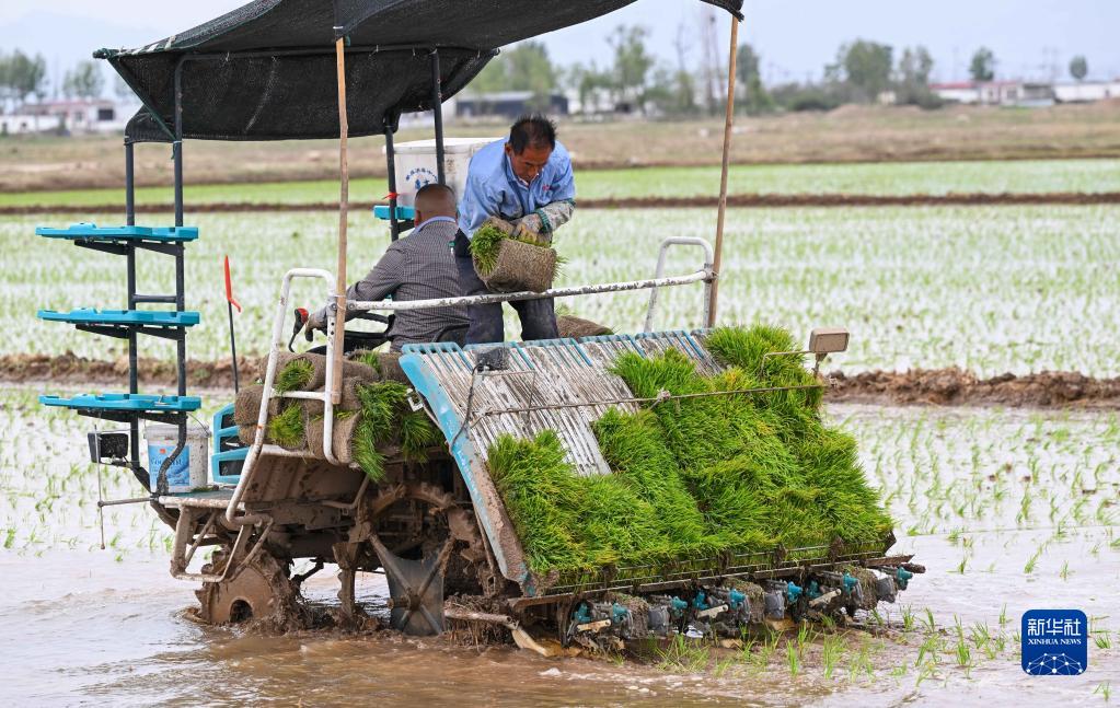 5月23日,達拉特旗昭君鎮村民在鹽堿地改良水稻田中使用農機插秧。
