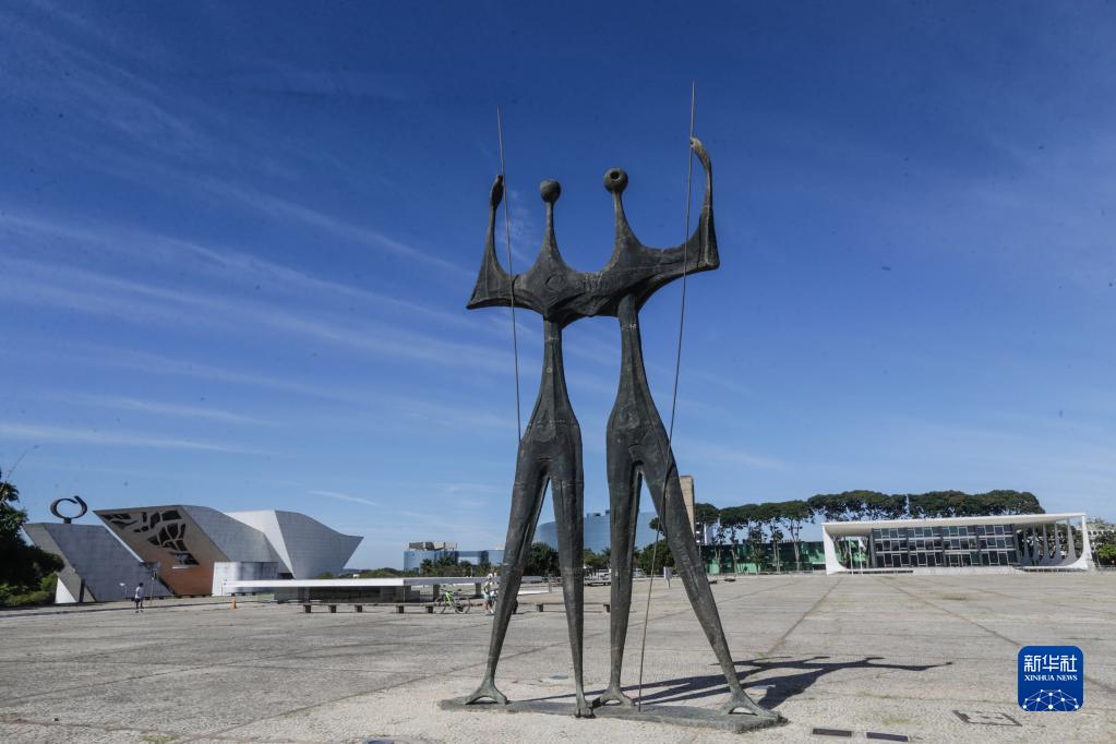 這是5月22日在巴西首都巴西利亞三權廣場(chǎng)拍攝的首都開(kāi)拓者雕像。
