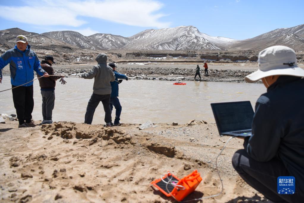 科考隊員在新疆東昆侖庫木庫里盆地通過(guò)多普勒測流船測量河流流速流量(5月22日攝)。
