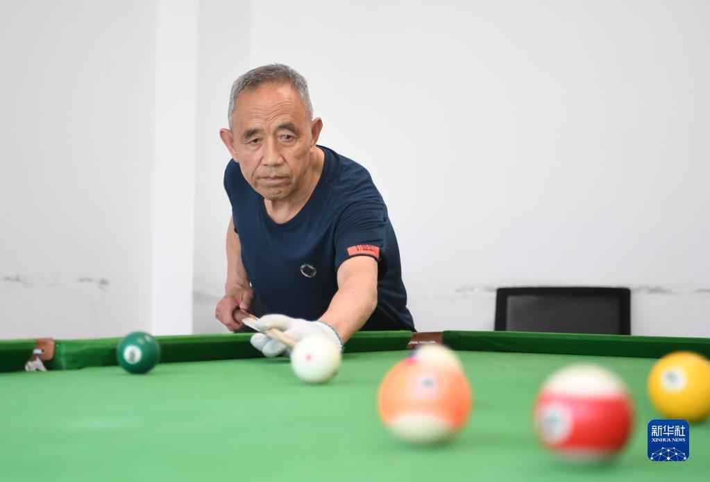 河北雄安新區容東片區南文營(yíng)社區居民在社區養老驛站娛樂(lè )室打臺球(5月23日攝)。