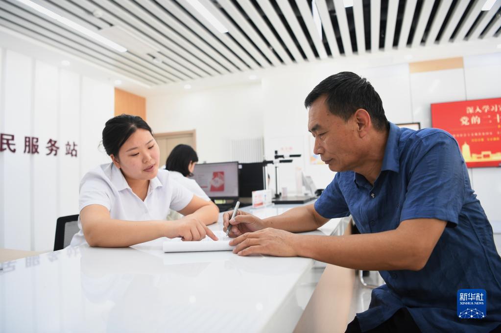 河北雄安新區容東片區南文營(yíng)社區居民(右)在社區便民服務(wù)站辦理業(yè)務(wù)(5月23日攝)。