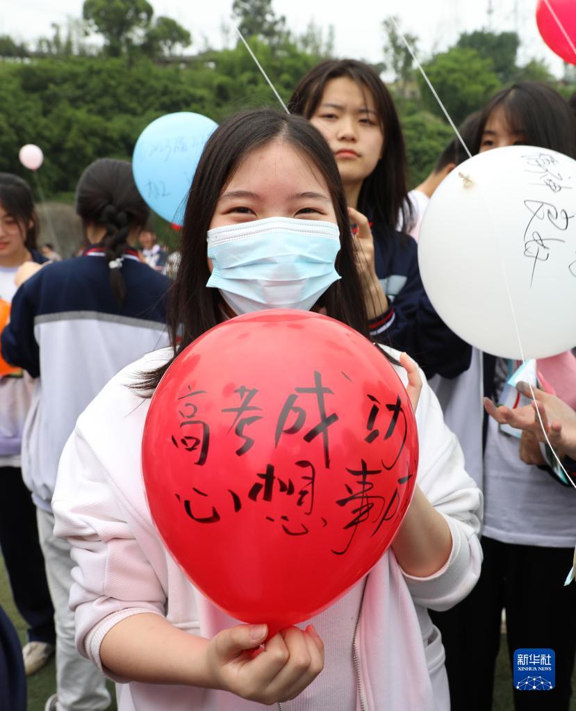 5月23日,在四川省廣安市武勝中學(xué),一名高三學(xué)生在氣球上寫(xiě)下祝福與愿望準備放飛。