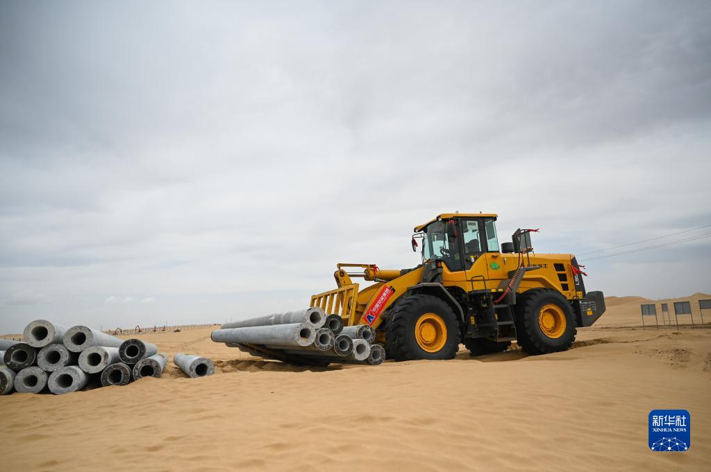 5月24日,機械工程車(chē)輛在達拉特旗庫布其沙漠中運輸建材。