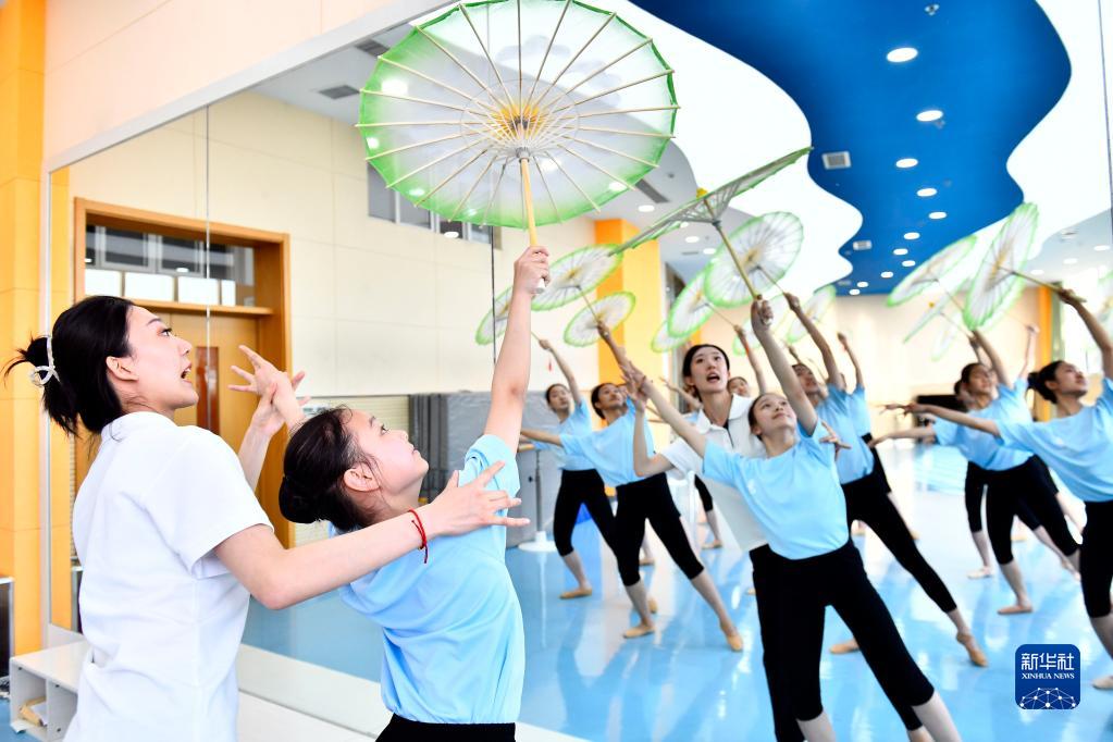 5月23日,在濟南市歷城二中聞韶藝術(shù)館,于恩賜老師帶著(zhù)同學(xué)們在練習舞蹈。