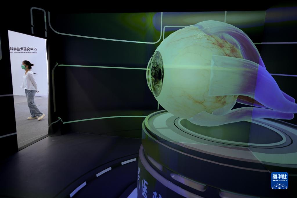 5月24日,在2023年全國科技活動(dòng)周暨北京科技周活動(dòng)現場(chǎng)拍攝的通過(guò)沉浸式裸眼混合現實(shí)技術(shù)呈現的防控近視科普宣教空間。