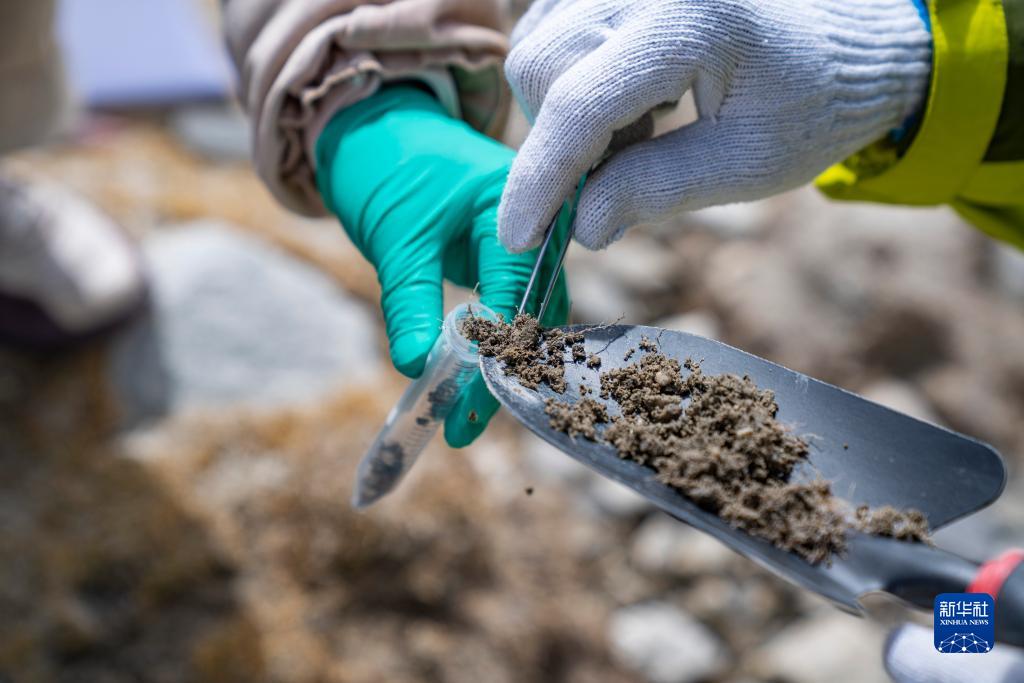 在珠峰登山大本營(yíng)附近,來(lái)自西藏大學(xué)生態(tài)環(huán)境學(xué)院的科考隊員在收集土壤樣本(5月22日攝)。