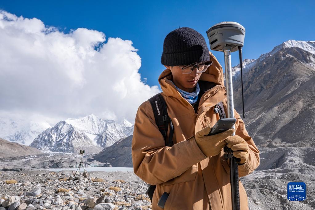 在珠峰海拔約5300米處,來(lái)自中國科學(xué)院西北生態(tài)環(huán)境資源研究院的科考隊員薛雨昂在對冰川進(jìn)行實(shí)時(shí)差分GPS定位(5月15日攝)。