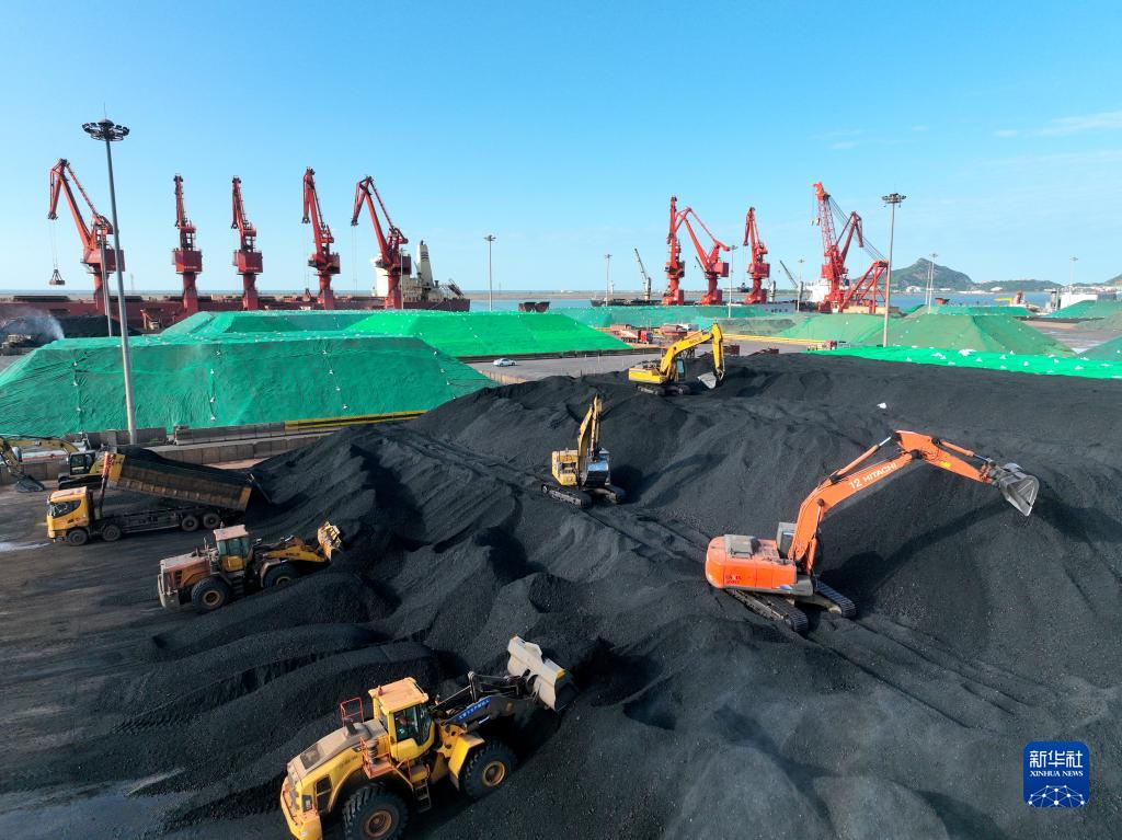 5月24日,大型機械在江蘇省連云港港煤炭碼頭堆放儲存剛從貨輪卸運的電煤(無(wú)人機照片)。