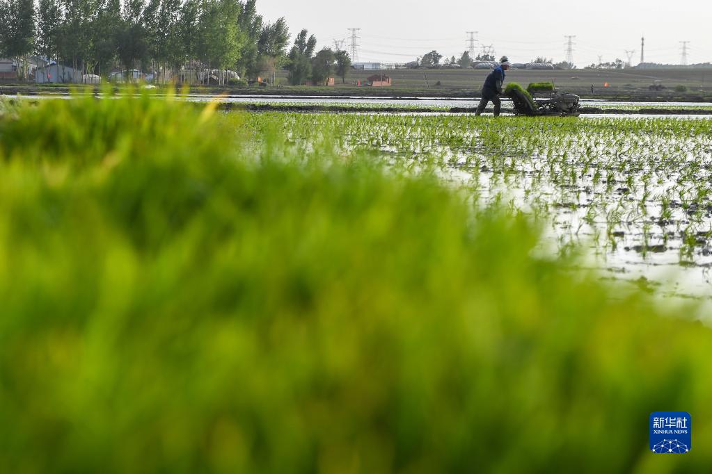 5月24日,農民在吉林省長(cháng)春市九臺區龍嘉街道紅光村操作農機進(jìn)行水稻插秧。