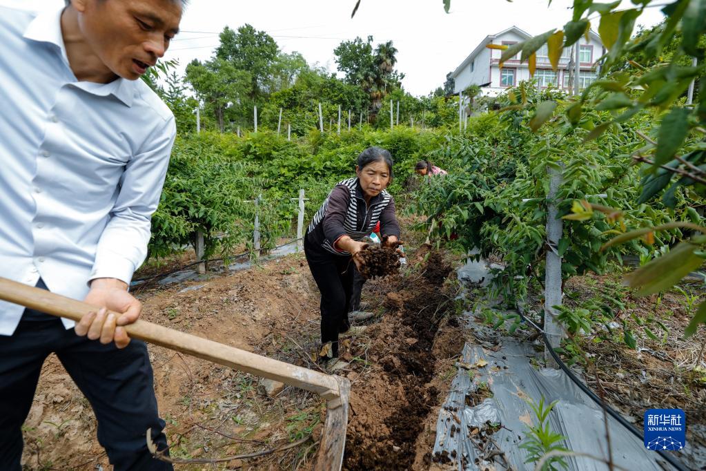 5月24日,在南江縣高橋鎮桅桿村,種植大戶(hù)茍碧松(左一)帶領(lǐng)當地百姓,將南江黃羊糞制成的有機肥施到金銀花田里。