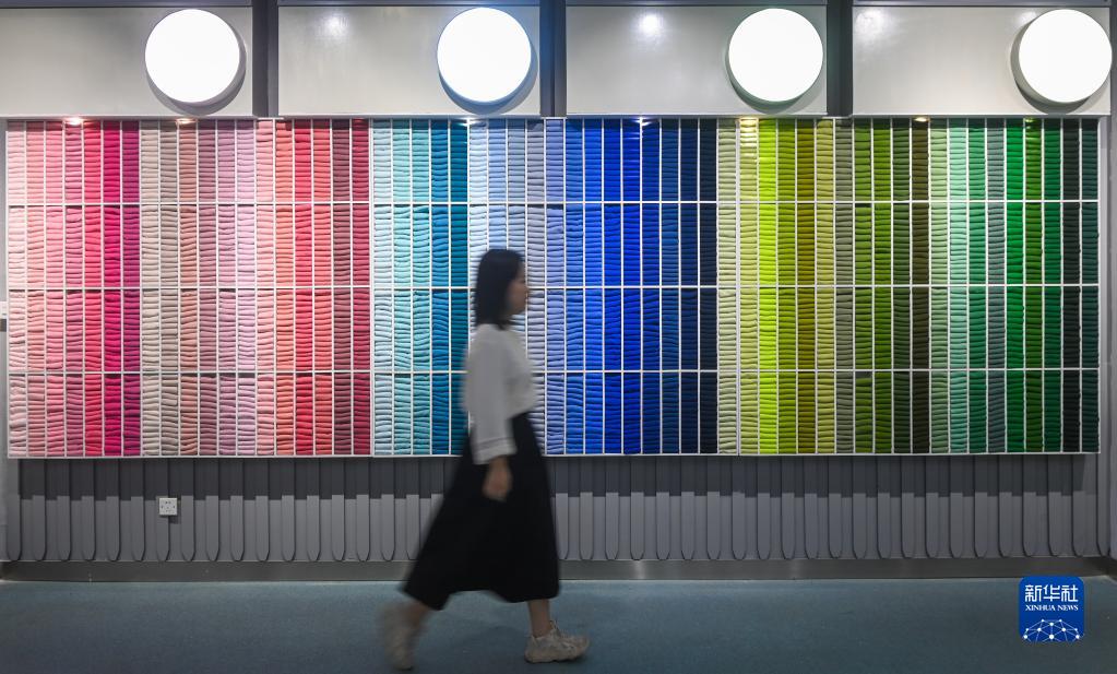 5月25日,游客在參觀(guān)大唐襪業(yè)博物館的彩色襪子墻。