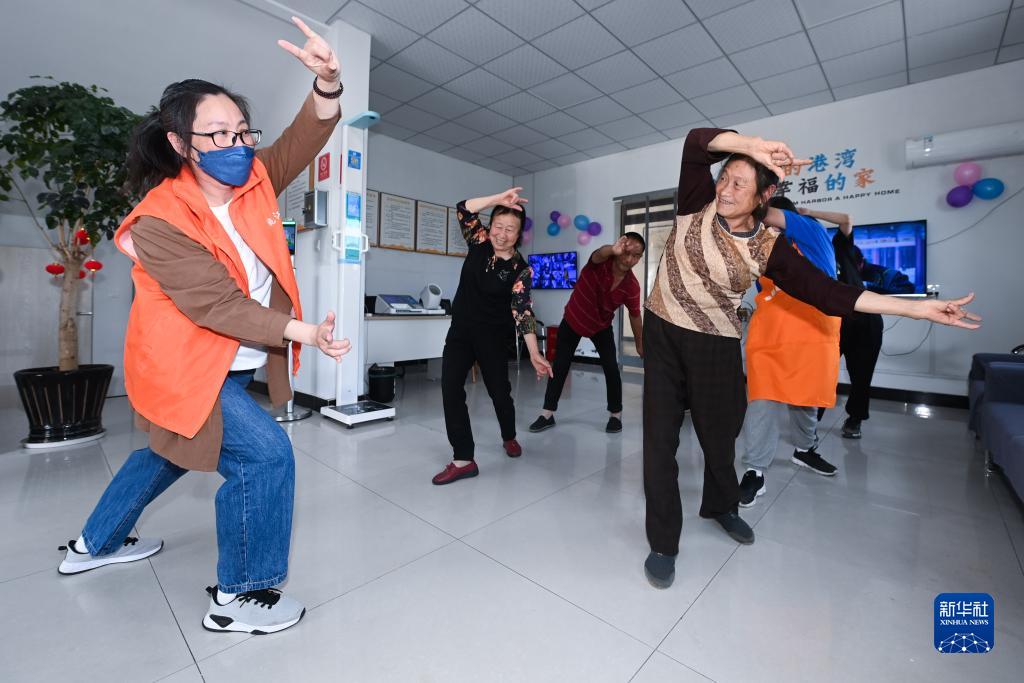 5月25日,在諸暨市姚江鎮的鎮級居家養老中心內,文化志愿者在教老人學(xué)習“五禽戲”。