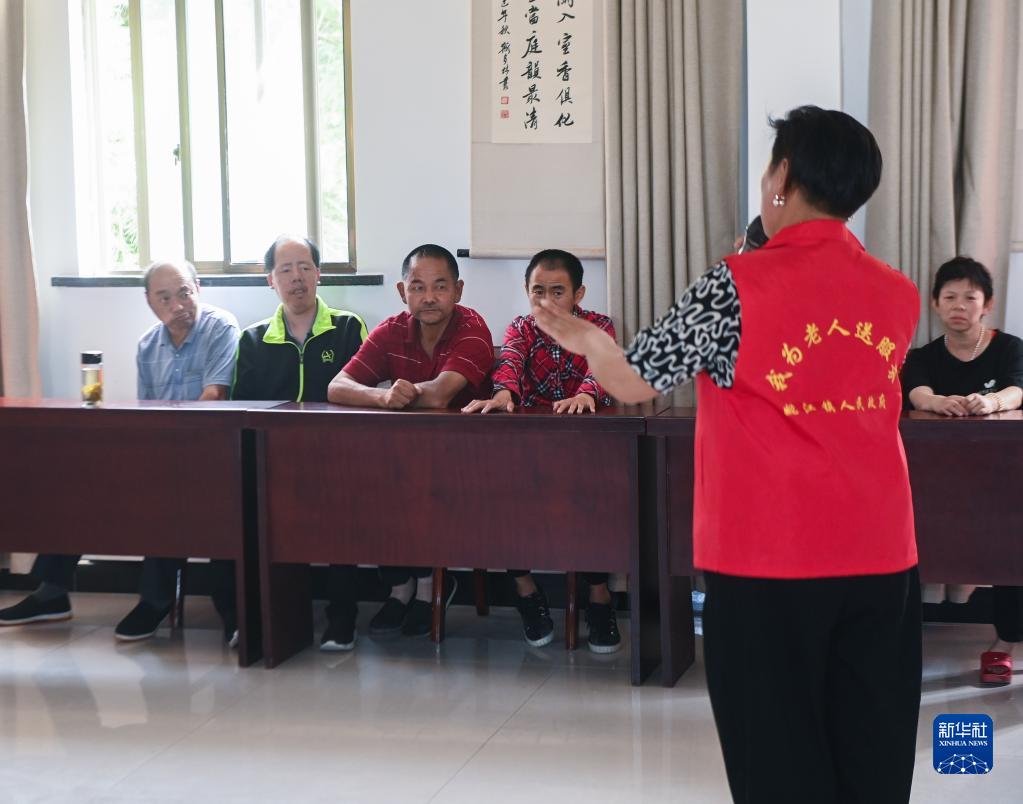 5月25日,在諸暨市姚江鎮的鎮級居家養老中心內,文化志愿者在給老人表演節目。
