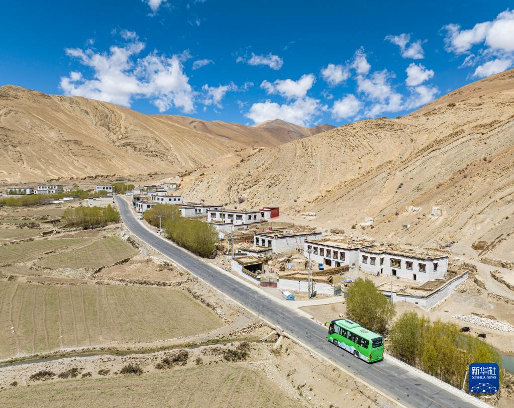 一輛載有游客的環(huán)保大巴車(chē)正駛向珠峰(5月25日攝,無(wú)人機照片)。