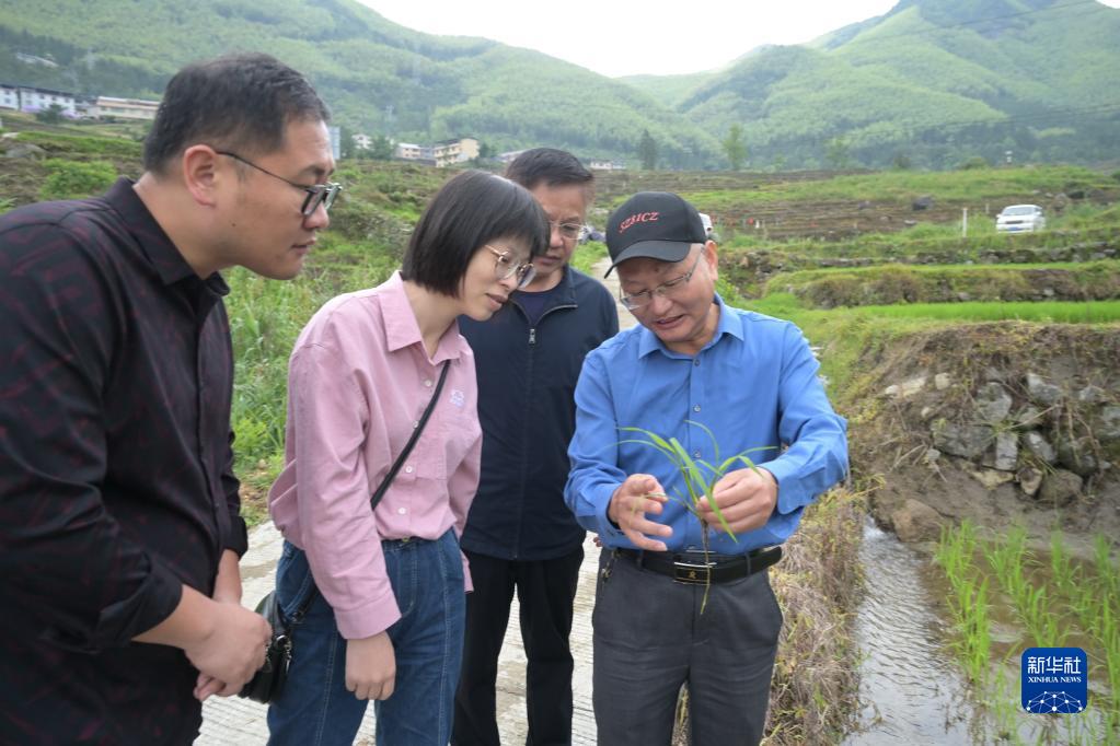 5月24日,福建省農科院水稻研究所專(zhuān)家黃庭旭(右一)在尤溪縣聯(lián)合鎮連云村查看他的團隊培育的紫兩優(yōu)737品種生長(cháng)情況。