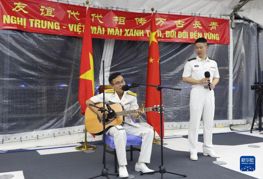 5月24日晚,在越南峴港,越方軍人(左)在戚繼光艦甲板招待會(huì )上邀請中方學(xué)員合唱歌曲。