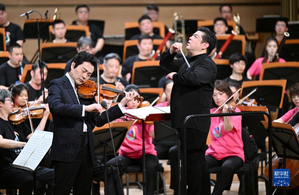 5月25日,在天津大劇院音樂(lè )廳,小提琴演奏家呂思清(左)和指揮李飚(右)在舞臺上演出。