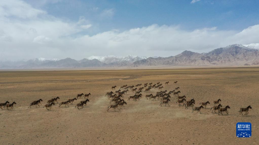 一群藏野驢在阿爾金山國家級自然保護區奔跑(5月23日攝,無(wú)人機照片)。