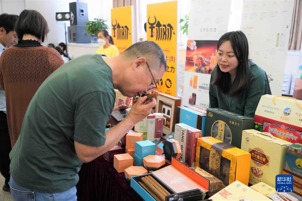5月26日,推介會(huì )現場(chǎng)的工作人員為參觀(guān)者介紹西藏特色產(chǎn)品。