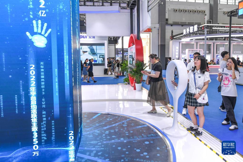 5月26日,參觀(guān)者在數博會(huì )展館體驗滿(mǎn)幫“數據瀑布”抓取。