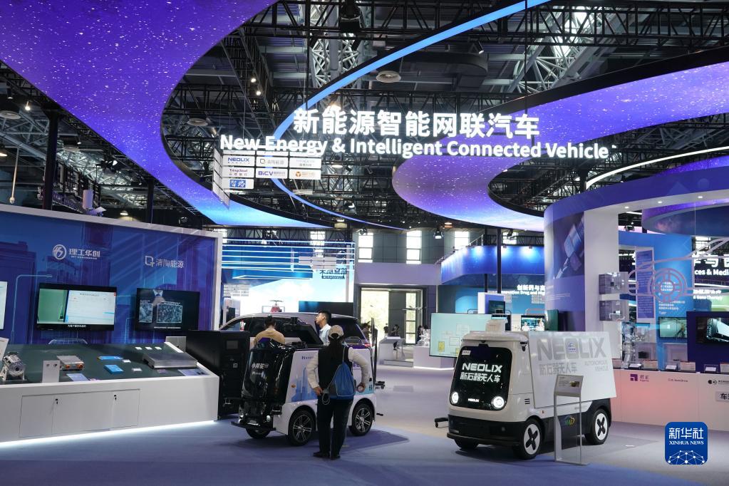 5月26日在中關(guān)村國家自主創(chuàng )新示范區展示中心拍攝的新能源智能網(wǎng)聯(lián)汽車(chē)展區。