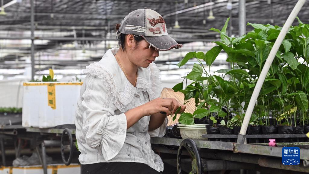 在“木瓜哥”的智能大棚內,一名村民在嫁接黃金百香果苗(5月25日攝)。