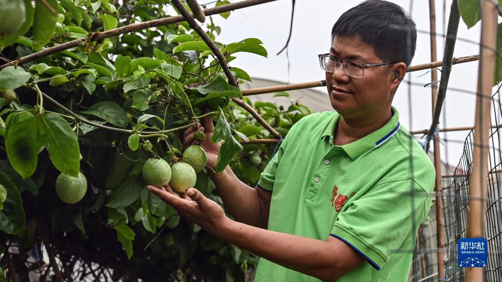 在欽州市欽南區犀牛腳鎮大坪村一戶(hù)庭院內,“木瓜哥”查看黃金百香果長(cháng)勢(5月25日攝)。