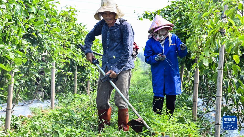 在欽州市欽南區犀牛腳鎮烏雷村,村民護理黃金百香果園(5月25日攝)。