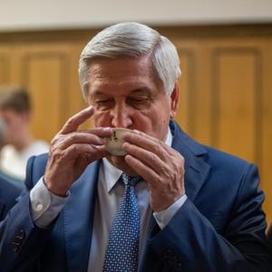 5月24日,在俄羅斯莫斯科的國家杜馬大樓,俄中友好協(xié)會(huì )主席、俄羅斯國家杜馬(議會(huì )下院)第一副主席伊萬(wàn)·梅利尼科夫(中)品味來(lái)自中國云南的茶。新華社記者 孟菁 攝